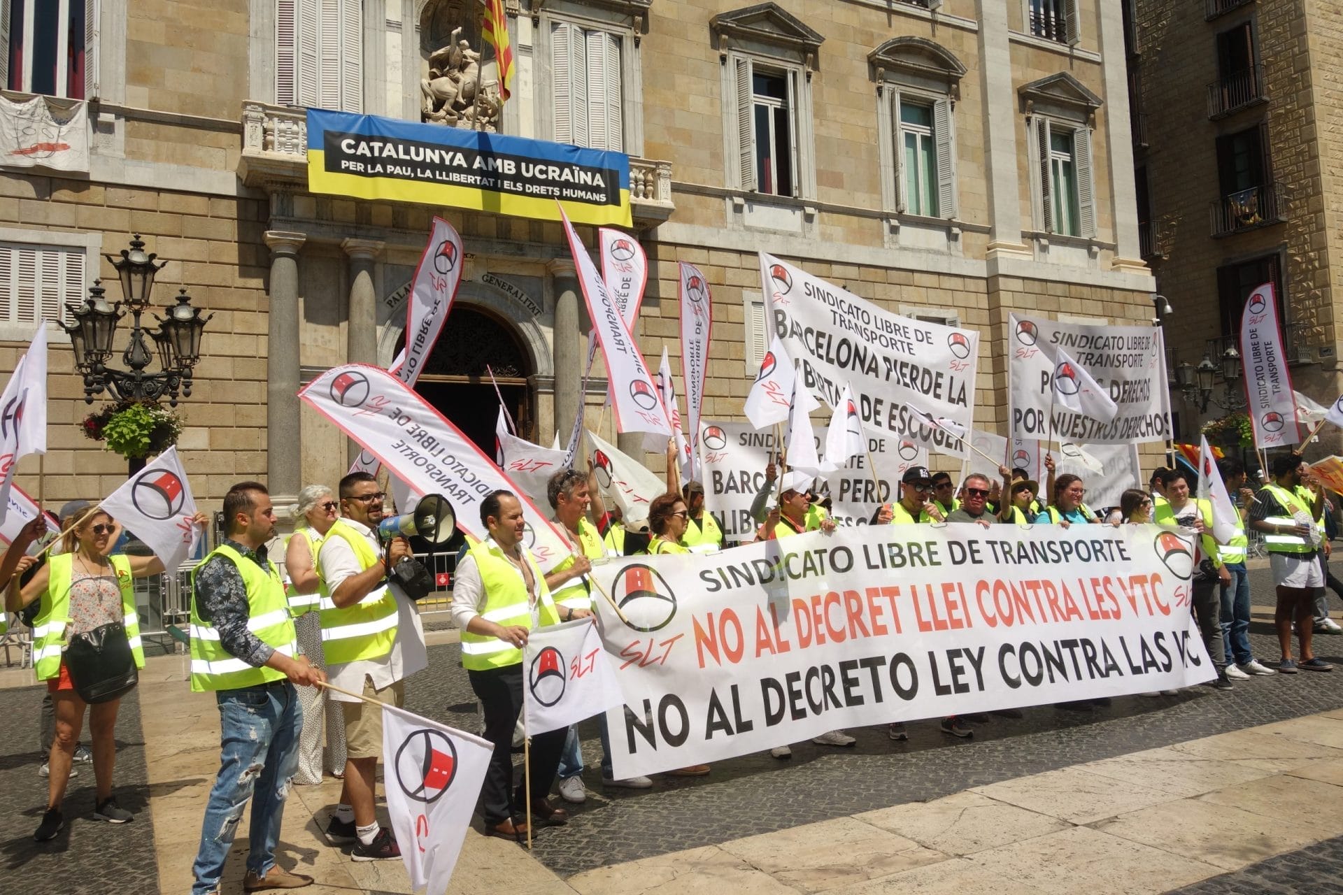 Centenares de trabajadores del sector VTC han protestado esta mañana con una marcha que ha pasado por delante de la Generalitat, donde han leído un manifiesto para denunciar los costes