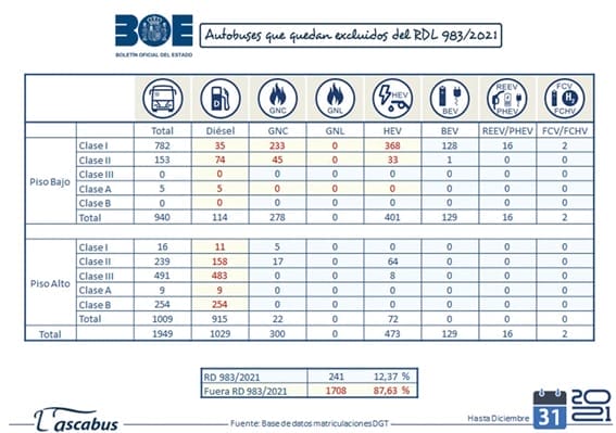 Tan solo un 12,37% de los autobuses matriculados en 2021 se pudieron acoger al Real Decreto 983/2021 de ayudas para la transformación de flotas de transporte de viajeros y mercancías de empresas privadas prestadoras de servicios de transporte por carretera, así como de empresas que realicen transporte privado complementario, en el marco del Plan de Recuperación, transformación y Resiliencia.